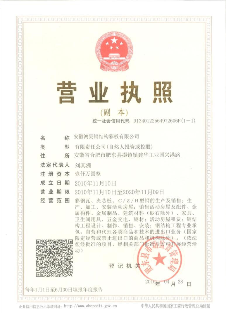 安徽鸿昊钢结构彩板有限公司是一家集钢结构、活动房生产、设计和专业安装为一体的综合性企业,本公司引进全自动彩钢夹芯板生产流水线以生产多种规格的彩钢复合夹芯板、彩钢瓦楞板、岩棉板、环保复合材料.流水线以生产多种规格的彩钢复合夹芯板、彩钢瓦楞板、岩棉板、环..